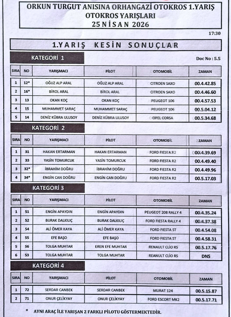 Peugeot 208 Rally4 ile yarışan Engin Apaydın(üstte) parkurdaki dört turu toplamda 4.35.24 ile tamamladı ve hem kendi kategorisi 3’de hem de günün genel klasmanında en hızlı isim olarak kaydedildi. K3’de en iyi 2’nci zamanı yapan Burak Dalkılıç (altta), genelde günün 2’ncisi olurken, Ford Fiesta R2 ile yarışan Hakan Ertarman (en altta), kategori 2’de en üst basamakta yer aldı, günün genel klasmanında ise 3’ncü oldu. Açık ve güneşli bir günde az sayıda seyircinin takip ettiği yarışta, dört kategoride toplam 17 ekip mücadele etti. Mahalli otokrosların ikincisi yarın yine Orhangazi’de gerçekleştirilecek.